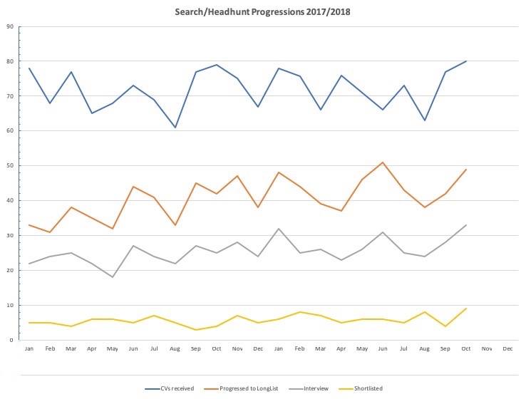 The second part the above 2-year analysis confirms the trend. The number of candidates headhunted into live processes has remained upheld, and even increased in terms of quality (onward progression)