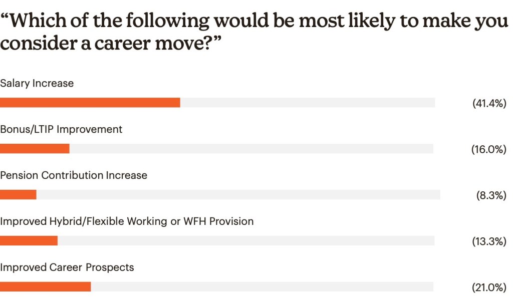 Drivers to cause employees to consider a move are more evenly split. 41% cite Salary, but Career Prospects now sits as the second most common reason, overtaking Hybrid Working and Bonus.