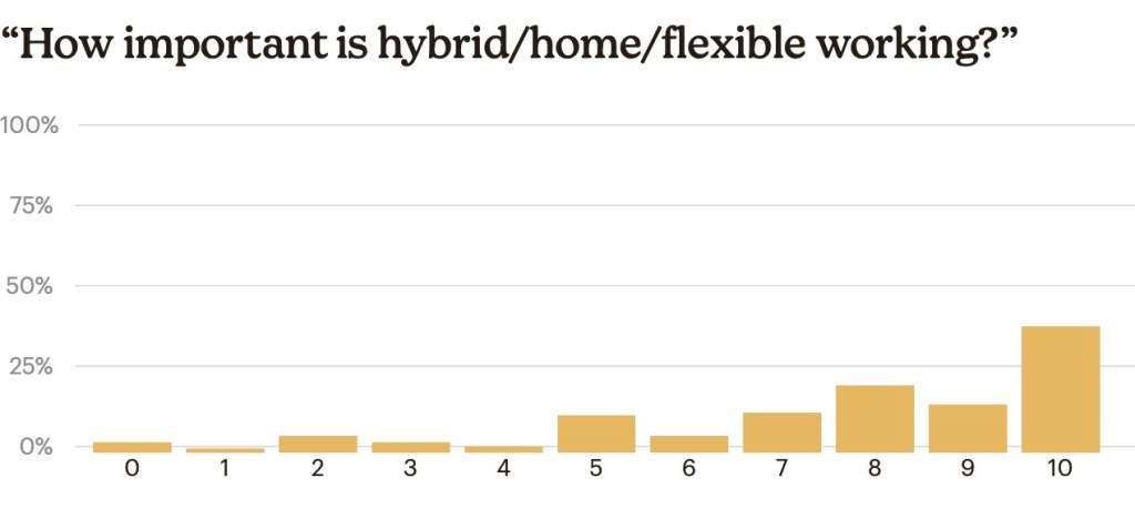Despite the above, Hybrid Working is still a key component of any package. Only 3% said it was unimportant, 33% calling it very important. The average score was 7.5.