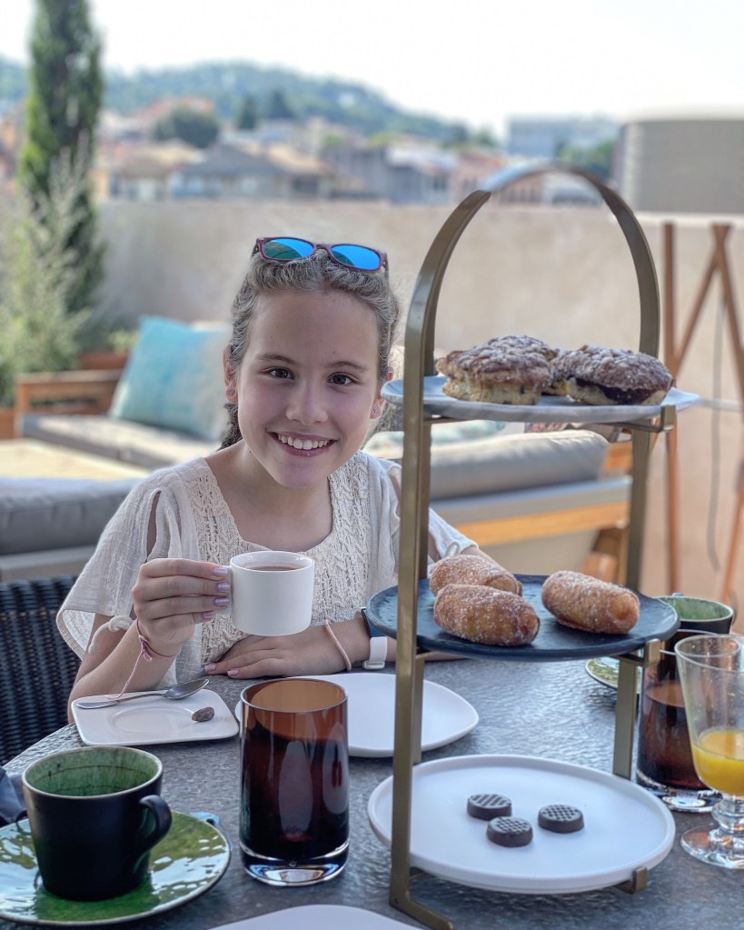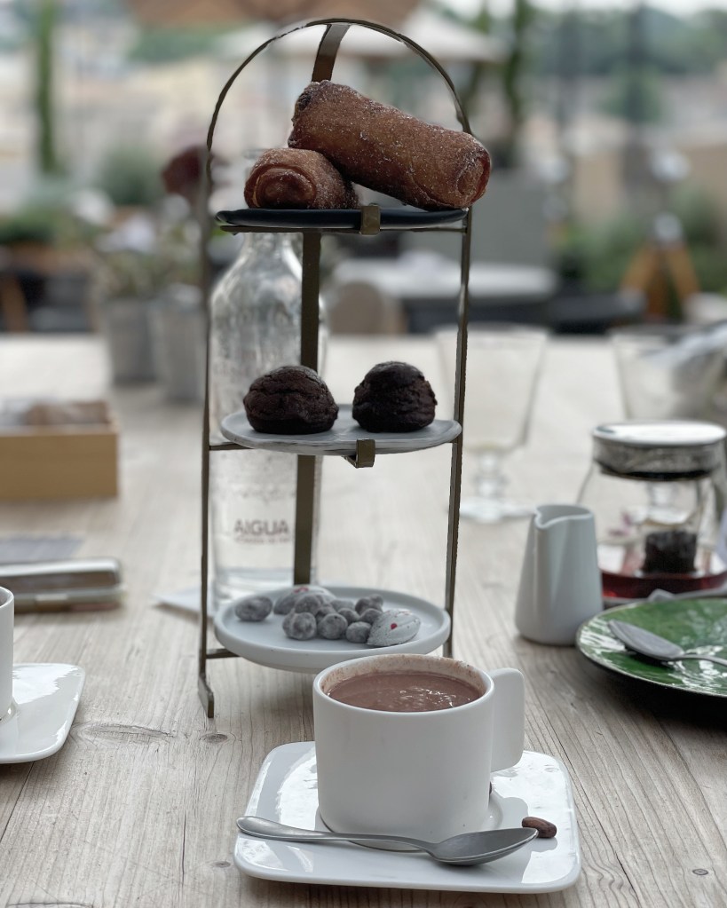But it is breakfast that rewrites the rules. Some guests come only for this: seven courses, a tasting menu for breakfast, such indulgence. Yoghurt and fruit, Catalan pan de coca and ham, poached eggs fried like croquettes, lamb served with chilled red wine, pastries that could pass for dessert anywhere else, and chocolate, in liquid, solid, molten and powdered form. A hot chocolate so intense it silences conversation, cakes that look like sculpture, coffee arriving until you surrender. We lingered ninety minutes each morning on the rooftop terrace, the coloured houses of Girona’s Old Town reflected in the river below, sunlight painting the cathedral beyond.