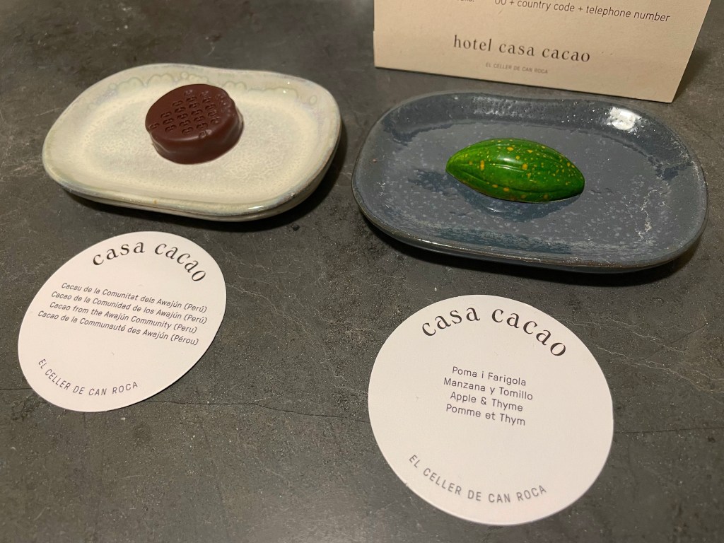 Our Junior Suite was vast and immaculate, Bassols linens soft as confession, cushions overstuffed with goose feather, carpets and plaids woven by Catalan artisans. The bathroom, all stone and light, featured rain showers and recycled wine-glass tumblers, tiny reminders that even the details had been coaxed into narrative. On the coffee table, a book, Casa cacao: El viaje de vuelta al origen del chocolate, charting Jordi Roca’s three-year pilgrimage to the jungles of Peru and Colombia, a reminder that the chocolate delicacies placed nightly beside the bed, were born of faraway communities he knows by name.