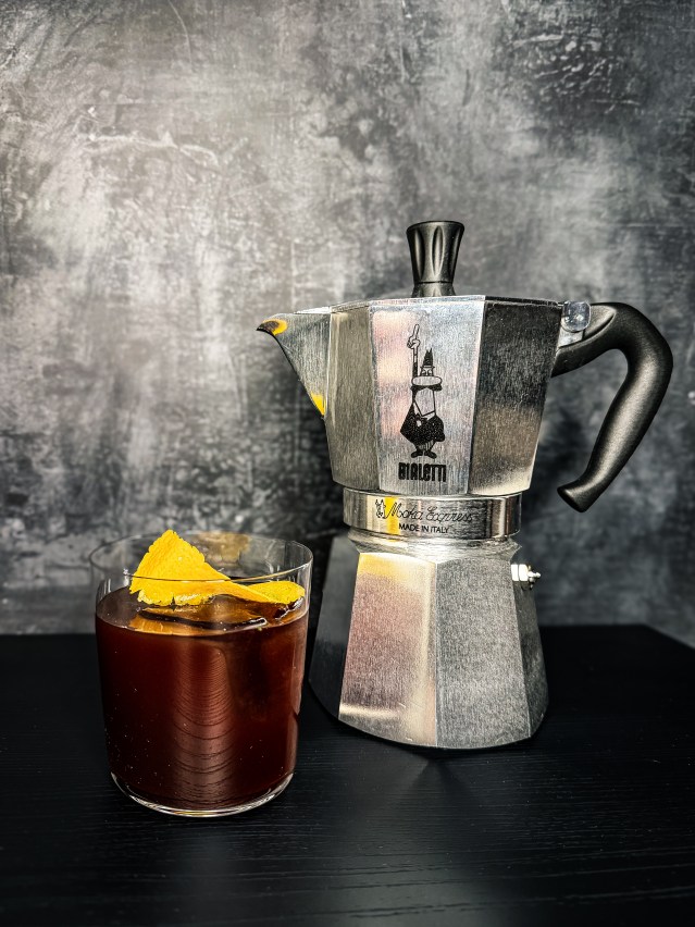This is possibly the variation I make the most. It takes a moment of preparation, starting by brewing espresso in a Moka Pot, but using sweet vermouth instead of water.