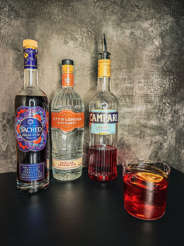 Really simple. Taking an Orange Infused gin (not a fruit gin – I use City of London Distillery’s Murcian Orange Dry Gin), then swap the Vermouth for Sacred’s English Spiced Vermouth, then Campari as normal, plus a dash of Angostura Orange Bitters. Recognisable as a Negroni, with just a hint of a Pomander’s Spiced Orange.