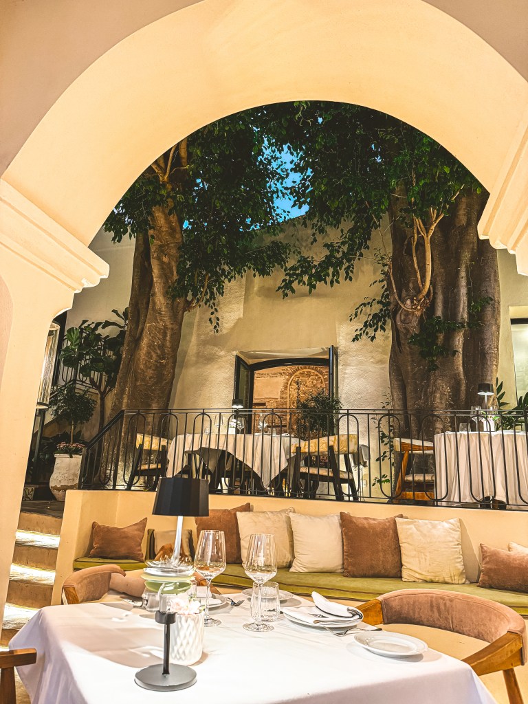 Dining, however, is where La Fonda struts its most theatrical step. Its rediscovered 16th-century hermitage forms the heart of the hotel’s restaurant, where honey-stone walls and zig-zag tiled floors glow beneath a glass roof. Executive Chef Jorge González Carmona, trained at Madrid’s Ritz and Robuchon’s kitchens, sends out Andalusian produce in modern dress: flame-grilled artichoke with squid, pata negra ravioli, lamb perfumed with Pedro Ximenez. Bread arrives with roasted garlic paste that could start a small addiction; cheese boards parade with Andalusian sherry; cocktails appear with candyfloss clouds, a wink to Marbella’s feria. Outside in the Garden Patio, Champagne flows beneath ancient walls, DJs spin beside orange trees, and a sense of Marbella’s golden age returns, albeit newly dressed.